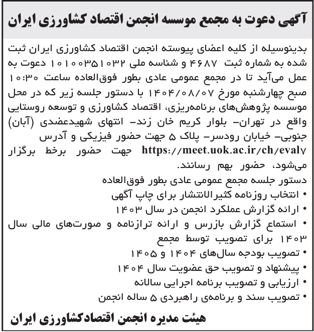 آگهی دعوت به مجمع موسسه انجمن اقتصاد کشاورزی ایران