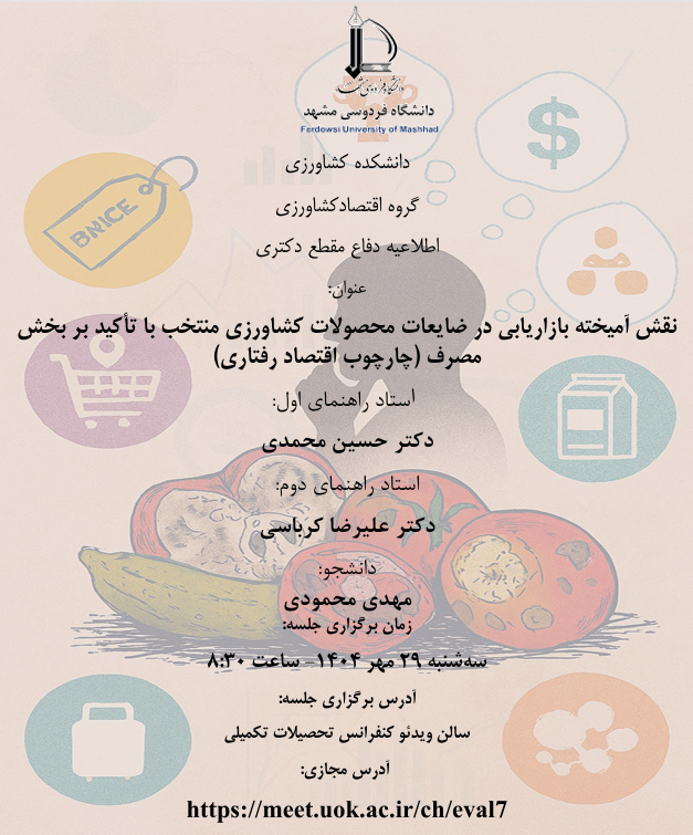 جلسه دفاع از رساله دکتری با عنوان؛ نقش آمیخته بازاریابی در ضایعات محصولات کشاورزی منتخب با تأکید بر بخش مصرف (چارچوب اقتصاد رفتاری)